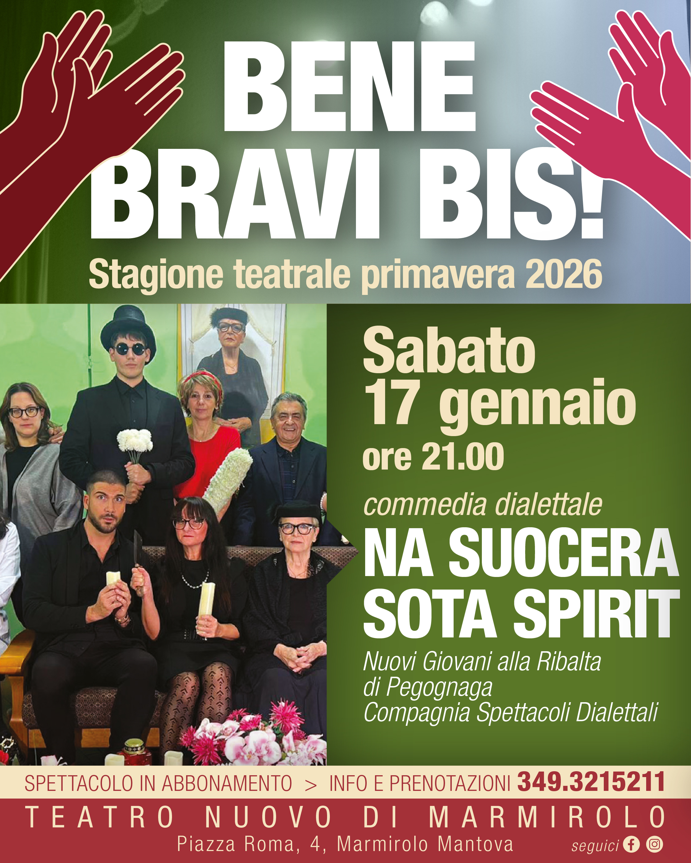 Sabato 17 gennaio alle ore 21:00 vi aspettiamo al Teatro Nuovo di Marmirolo per il primo spettacolo della nuova stagione teatrale BENE BRAVI BIS! con la divertentissima commedia dialettale "Na suocera sota spirit" della compagnia Nuovi Giovani alla Ribalta.